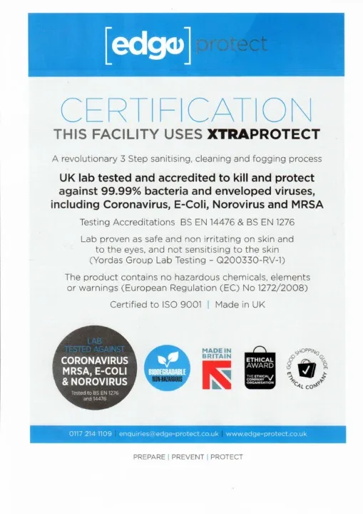 The solution xtraprotect has been lab tested against CORONAVIRUS, MRSA,E-COLI AND NOROVIRUS