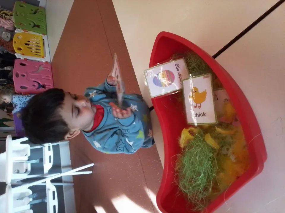 We have also been doing lots of fun Easter activities, such as an Easter egg hunt in shredded paper, a sensory tray filled with yellow feathers, Easter flash cards and pretend grass, and exploring Easter shaped pasta!