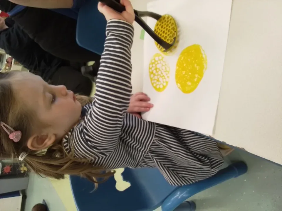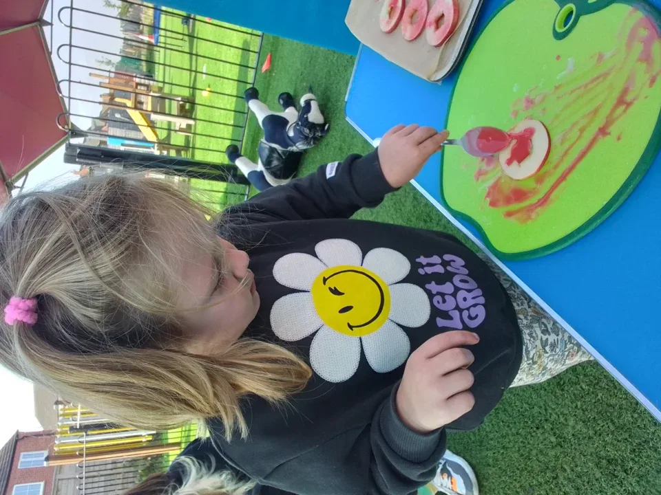 We made our own healthy donuts out of apple slices and decorated them with icing sugar and we also painted our own corn and ice cream using lots of different colours and different media’s such as potato printing and using a potato masher.