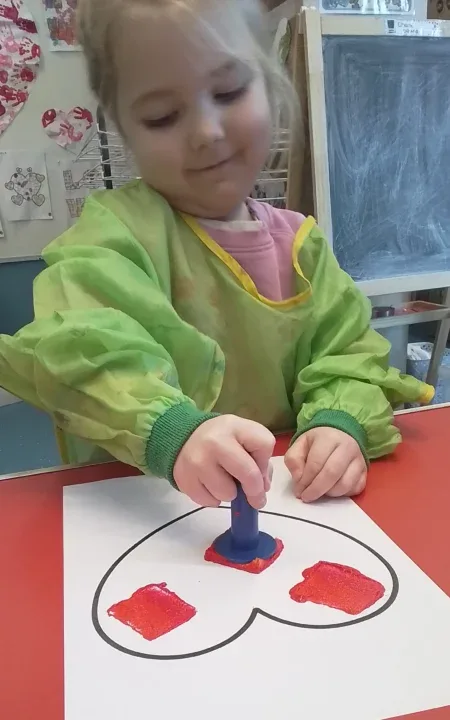 Last week the children explored ‘Valentine’s Day’. They made Valentine’s cards, using paint dabbers to decorate a large heart in the middle and thein gluing heart shapes on the outside. They also had their hands painted to print on a large heart to go on display. As a group, we discussed what we love and how we show our love.