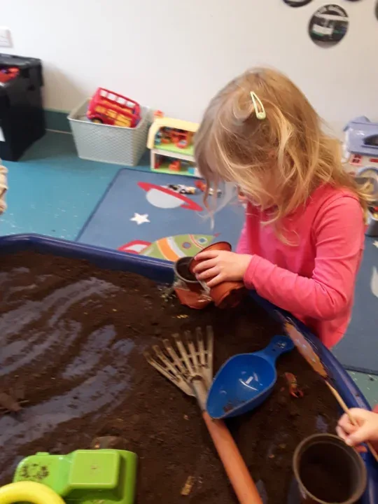 We had lots of discussions at circle time about flowers and how they grow, we also talked about what other things we grow in the ground. The children offered up lots of suggestions including potatoes and carrots. We used real soil in our tuff tray and a range of props such as flowerpots, spades, and watering cans for the children to play with. The children built giant sunflowers using the Duplo bricks by ordering the numbers up to ten!