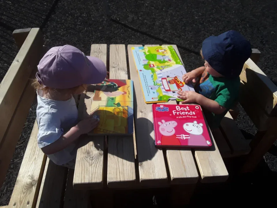 Toddlers reading in the sun